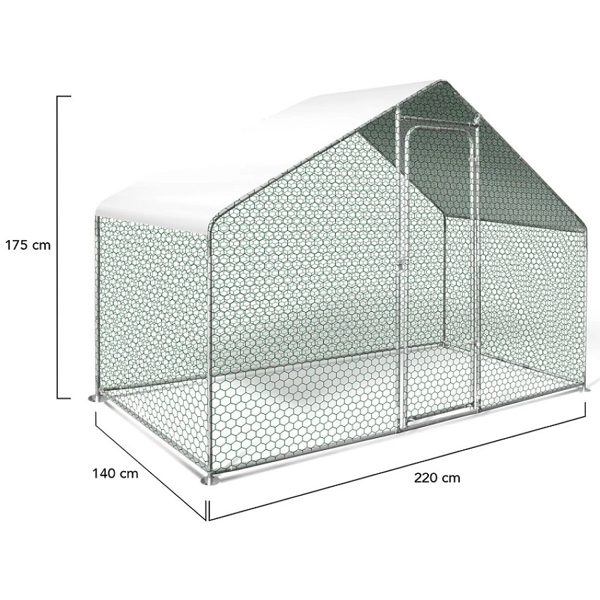 Élever des poules dans son jardin ? C’est facile et rapide grâce à l’installation d’un enclos à poules 2,2×1,4 M. Disposez votre cage à poules de 3m² dans votre jardin et récoltez de bons œufs frais tous les jours.Cet enclos poulailler en grillage galvanisé de 1,75 M de hauteur vous permet de sécuriser votre basse-cour à petit prix. En effet, ce poulailler est équipé d’une bâche de toit waterproof et anti-UV 180gr/m2 en polyester, ce qui permet aux volatiles de profiter d’un espace ombragé et d’une protection contre la pluie.Pensé et conçu par des éleveurs professionnels, ce parc en acier galvanisé est robuste et pratique. Équipé d’une porte avec fermeture à loquet, vous pouvez facilement prendre soin de vos poules et recueillir les œufs fraîchement pondus. Vaquez sereinement à vos occupations : vos animaux sont en lieu sûr !Le grillage (maille environ 25x25mm / 1 mm d’épaisseur) protège efficacement les animaux des prédateurs comme les renards. Vos poules peuvent ainsi prendre l’air paisiblement dans un espace ventilé et parfaitement clos.Astuce : pensez à ancrer les pieds de votre enclos pour qu’aucun intrus ne puisse creuser et passer par dessous sous votre grillage.Pour plus de confort, complétez votre enclos en y intégrant un poulailler en bois*, ainsi vos poules disposeront d’un endroit douillet pour y pondre leurs œufs ! ID Market vous propose une large gamme de poulaillers à prix mini, profitez-en !Dimensions enclos poules 3 m² parc grillagé – Dimensions totales hors tout : Longueur 220 CM x largeur 140 CM x Hauteur 175 CM- Diamètre des tubes de la structure : 25 MM – Épaisseur 0,65 MM- Taille des mailles : environ 25 x 25 MM – Grillage triple torsion- Piquet d’ancrage non fourni- Grillage vert ou gris selon arrivage- À monter soi-mêmePour plus de facilité de montage, nous vous conseillons d’être 2 personnes (temps estimé : 60 min).* Poulaillers en bois vendus séparément sur notre boutique en ligne.Retrouvez toutes nos différentes tailles d’enclos disponibles sur notre boutique en ligne :- Enclos poulailler 6 m² parc grillagé- Enclos poulailler 9 m² parc grillagé- Enclos poulailler 12 m² parc grillagé- Enclos poulailler 16 m² parc grillagé- Enclos poulailler 18 m² parc grillagé- Enclos poulailler 24 m² parc grillagéDécouvrez également toute notre gamme d’enclos poulaillers sur notre boutique en ligne !