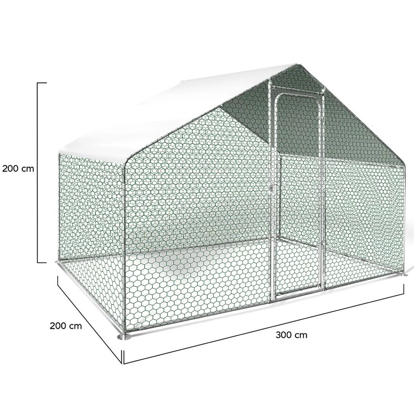 Conçu et pensé par des éleveurs pro, cet enclos robuste en acier galvanisé d’une maxi surface de 6 m² permet à votre basse-cour de gambader en toute sécurité !Ce parc grillagé (mailles environ 25×25 mm / 1 mm d’épaisseur) offre un espace bien fermé pour protéger vos volailles des prédateurs comme les renards. Pratique avec sa large porte à fermeture sécurisée (tube grand diamètre 32 mm), cet enclos est l’habitat extérieur idéal pour un élevage de 3 à 4 poules.Ses grandes dimensions, longueur 3 M x largeur 2 M x hauteur 2 M, permettent à vos animaux une liberté de mouvement et un espace optimal pour leur plus grand confort.Equipé d’une bâche de toit waterproof et anti-UV 150 gr/m² en polyester, cette volière offre une partie ombragée et une protection contre la pluie.Vous pouvez compléter cette volière en installant un poulailler bois à l’intérieur pour permettre la ponte de vos poules et ainsi récolter de bons œufs frais tous les jours.Astuce : pensez à ancrer les pieds de votre enclos pour qu’aucun intrus ne puisse creuser et passer par dessous sous votre grillage.Dimensions enclos poules 6 m² parc grillagé- Dimensions totales hors-tout : Longueur 300 x largeur 200 x Hauteur 200 CM- Diamètre des tubes de la structure : 25 MM- Taille des mailles : environ 25 x 25 MM – Grillage triple torsion- Piquet d’ancrage non fourni- Grillage vert ou gris selon arrivage- À monter soi-mêmePour plus de facilité de montage, nous vous conseillons d’être 2 personnes (temps estimé : 60 à 90 min). * Poulaillers en bois vendus séparément sur notre boutique en ligne.Retrouvez toutes nos différentes tailles d’enclos disponibles sur notre boutique en ligne :- Enclos poulailler 3m² parc grillagé- Enclos poulailler 9 m² parc grillagé- Enclos poulailler 12 m² parc grillagé- Enclos poulailler 16 m² parc grillagé- Enclos poulailler 18 m² parc grillagé- Enclos poulailler 24 m² parc grillagéDécouvrez également toute notre gamme d’enclos poulaillers sur notre boutique en ligne !